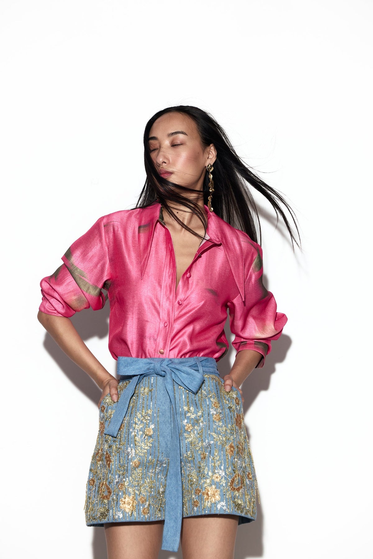 The ZURU SHORTS are crafted as a canvas of artistry and allure. Tailored with a front zipper and button closure, and cinched with a belt at the waist, they blend structure with charm. Side inseam pockets add ease, while the surface becomes a celebration of craft Äî adorned with intricate embroidery in golden and silver threads, enriched with patchwork, sequins, and beads. Beaded fringes scattered across the front catch the light with every movement, making the shorts shimmer with playful elegance. A piece that feels equal parts spirited and sophisticated, perfect for moments that call for statement and sparkle.