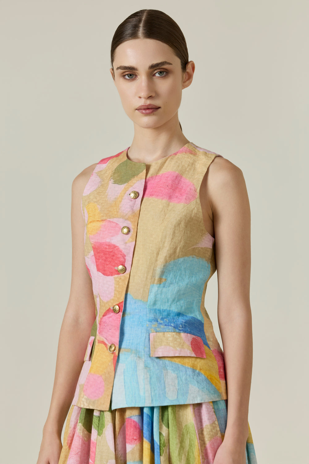 Novis by ANI is where vintage charm meets modern ease. The sleeveless top, with its round neckline, gold buttons, and flap pockets, brings just the right amount of polish—structured but never stiff. Paired with the gathered Novis skirt, it’s a nod to old-fashioned beauty, reimagined with contemporary grace. Style the set with leather sandals, oversized sunglasses, and a sculptural clutch for a look that’s as refined as it is relaxed.
