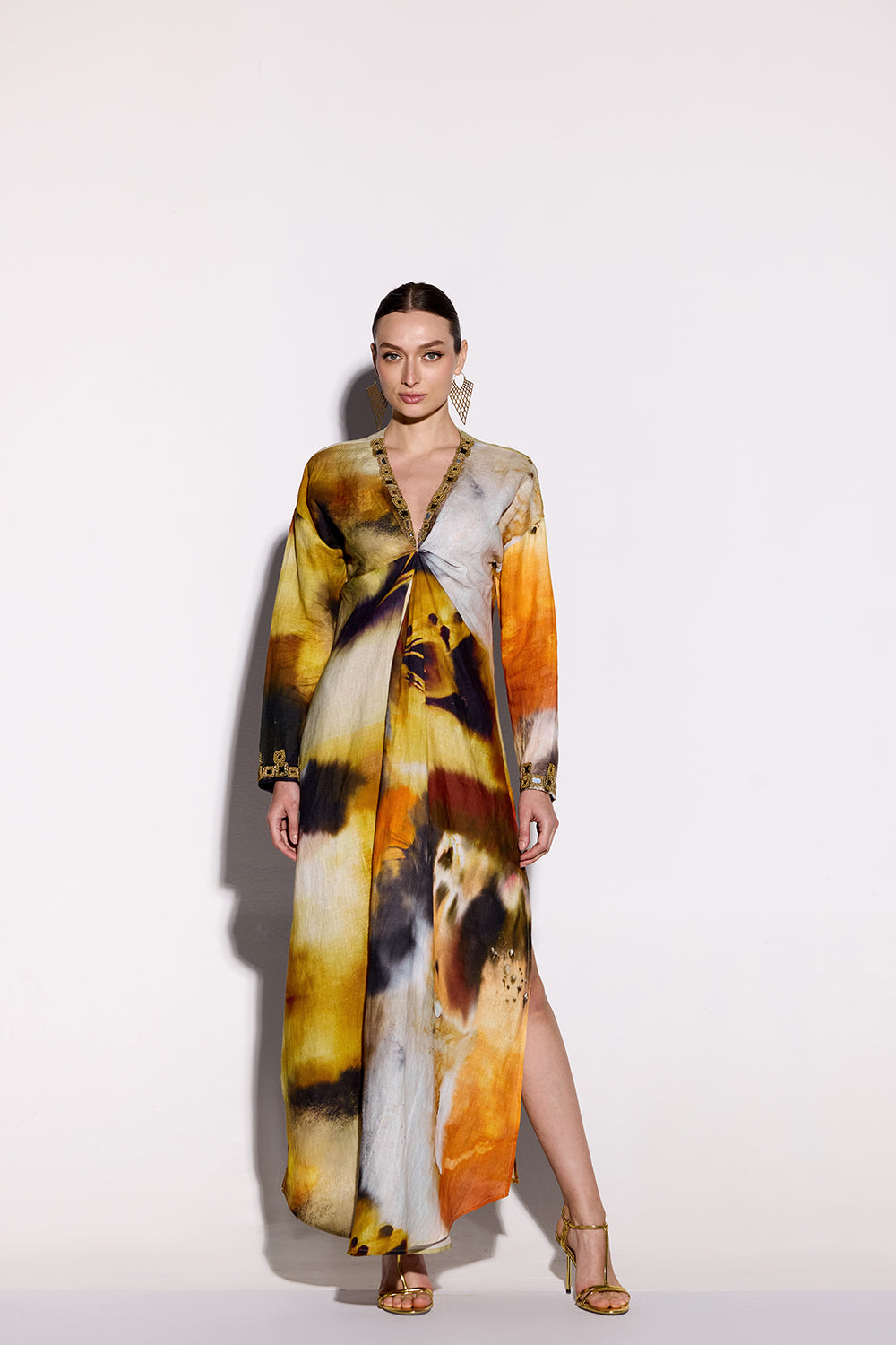 A kaftan that drapes the body like molten gold. The deep V-neckline plunges with
