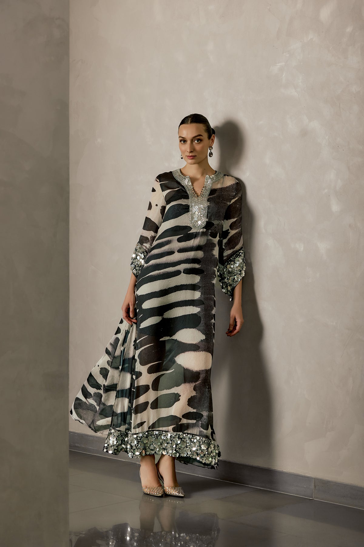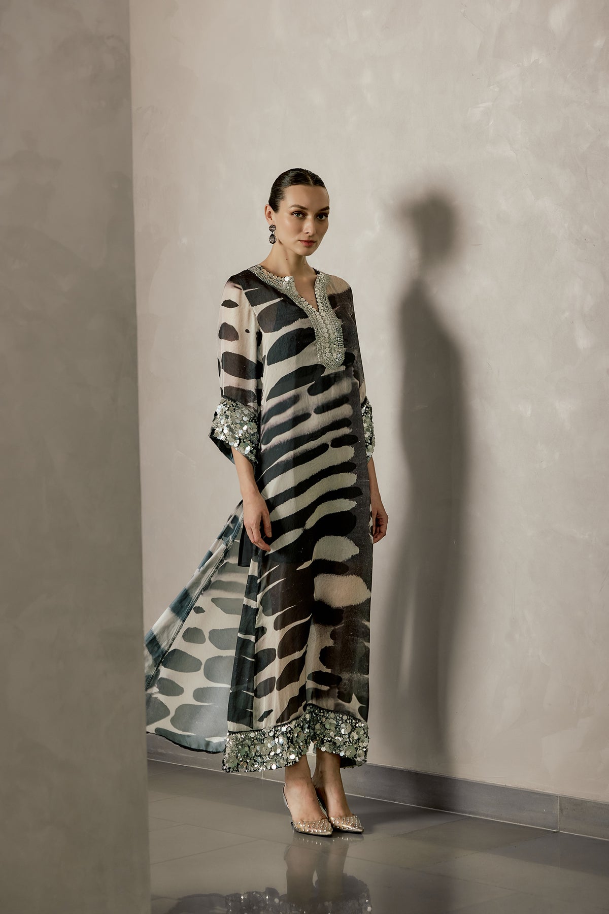 This effortlessly elegant kaftan with an underlay designed in a soft, flowing silhouette, this piece features a striking abstract print in monochrome tones. The neckline is adorned with delicate embellishments that add a subtle shimmer, while the sleeves and hem are finished with intricately detailed accents for a cohesive, elevated look.