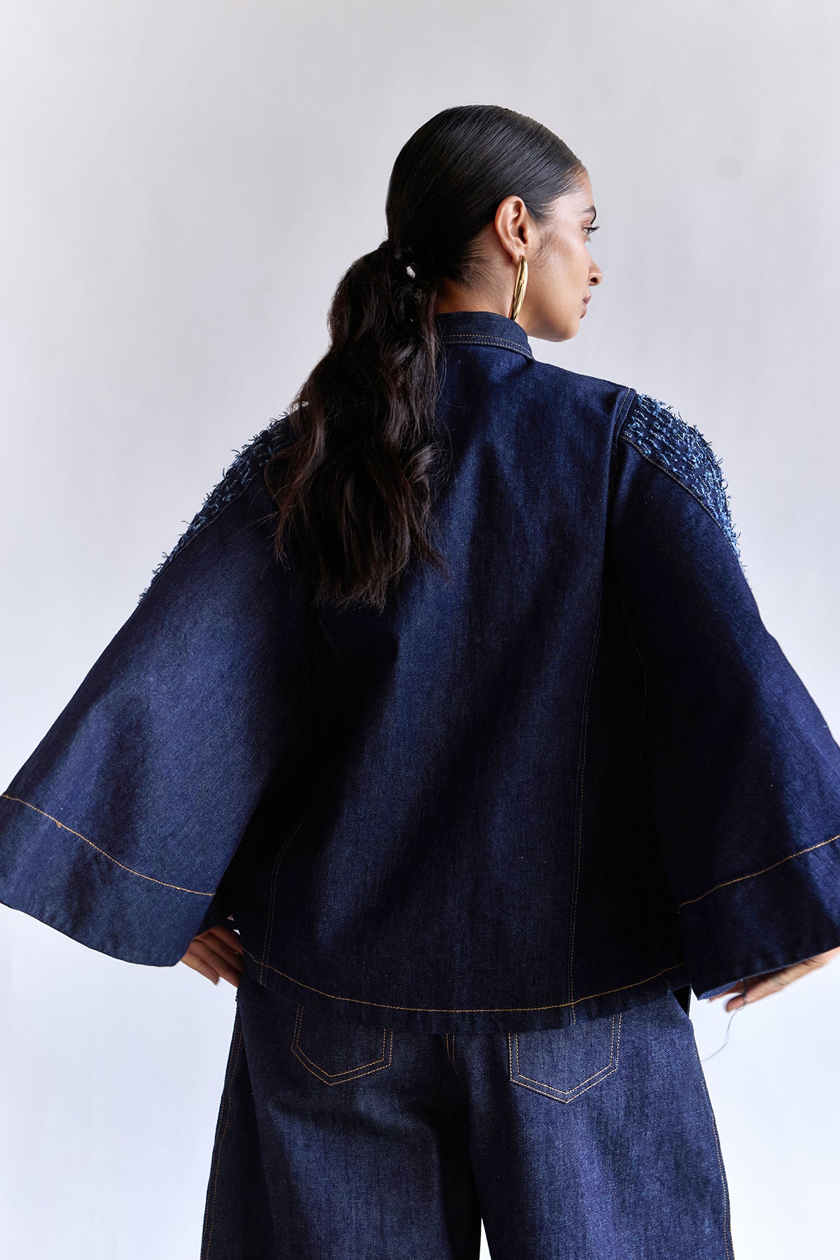 This denim cape top blends structure with fluidity, featuring dramatic draped panels that create a bold, sculptural silhouette. The hand-textured detailing at the yoke adds depth and craftsmanship, while gold-tone buttons elevate the look with refined contrast. A statement piece designed to transform any outfit effortlessly.