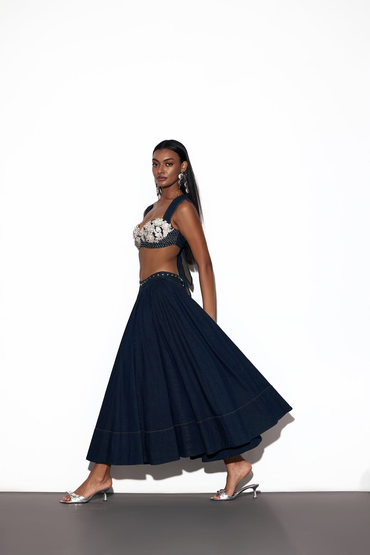 Too much drama, that too in denim. Ani's KOKA SKIRT is an old-fashioned beauty, in a new fashioned way. long pleated skirt, it's vintage charm made modern.