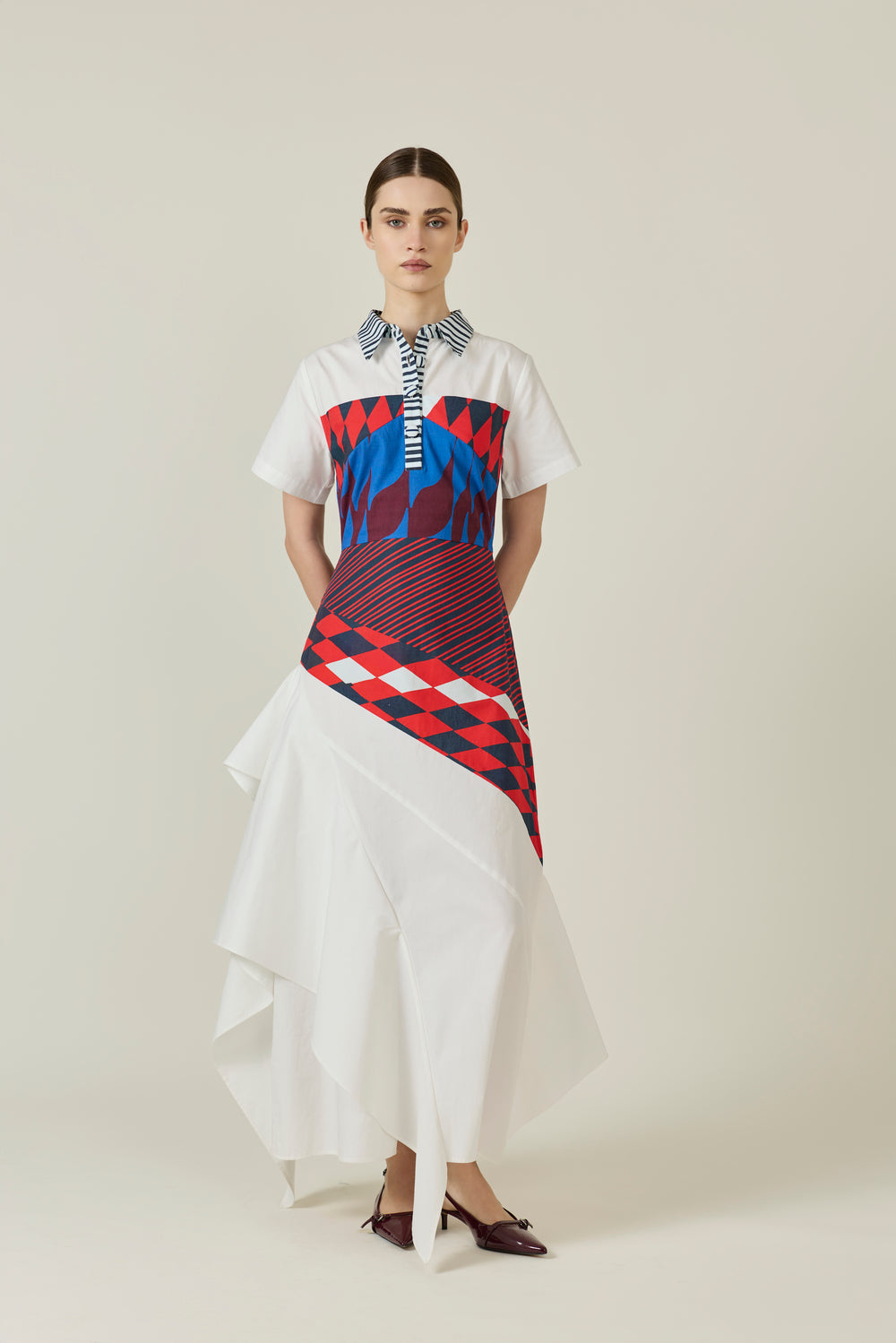 Composure with an edge. Paz by ANI is designed for the woman who keeps everyone guessing. Laced with mischief, a neat collar frames a v-neck that splices through scarlet diamonds and midnight stripes. It contours the torso beautifully before slipping into a crisp white skewed, swirling skirt. For a look that reads intelligent and unafraid, pair it with low-heeled leather mules and hair in a pony.