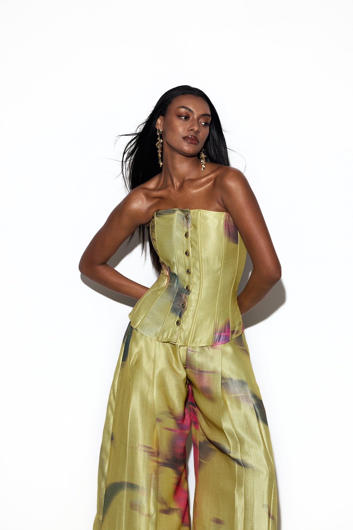 The SUZU CORSET is a celebration of curves and confidence. This corset-style tube top hugs the body in all the right places, sculpting a flattering silhouette. A row of golden buttons runs down the front, adding a touch of luminous charm to its structured yet playful design. Sleek, bold, and effortlessly chic, it's a piece that turns simplicity into statement.