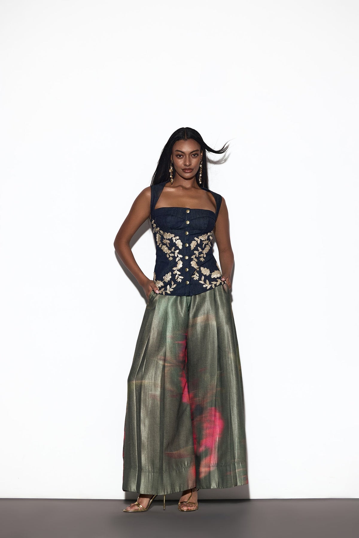 The TANI TOP is a graceful blend of structure and charm. With a square neckline and thick straps, it frames the shoulders elegantly, while the fitted silhouette hugs the body with subtle sophistication. A front button-down closure adds a polished touch, and golden floral embroidery across the front brings delicate shimmer, making the top feel both timeless and luminous - perfect for a look that balances elegance with understated allure.
