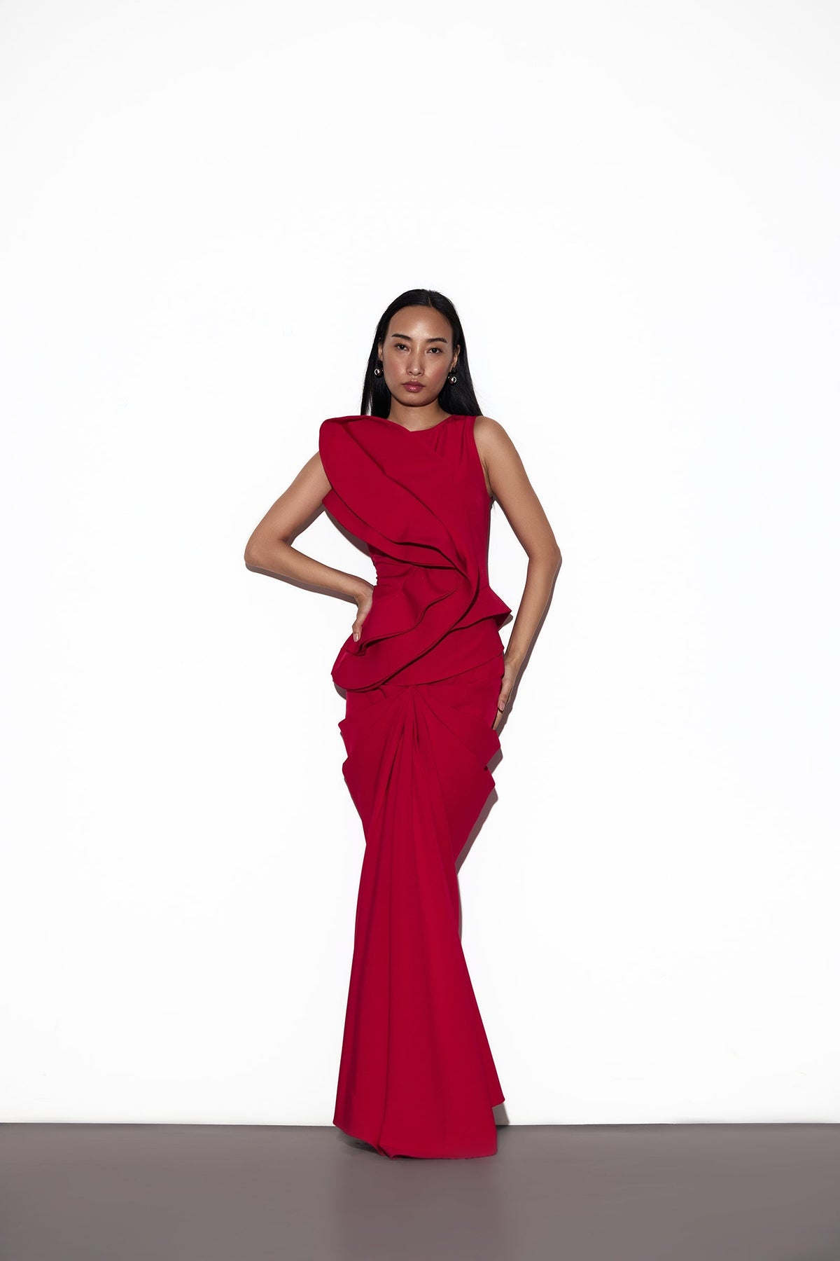 The AYA SKIRT, designed to flatter with every curve, this body-hugging skirt is cinched at the waist with a corset-like fit. A drape detail at the front softens the structure, adding fluid grace to its form. Secured with a back zipper, it creates a silhouette that feels both powerful and feminine.