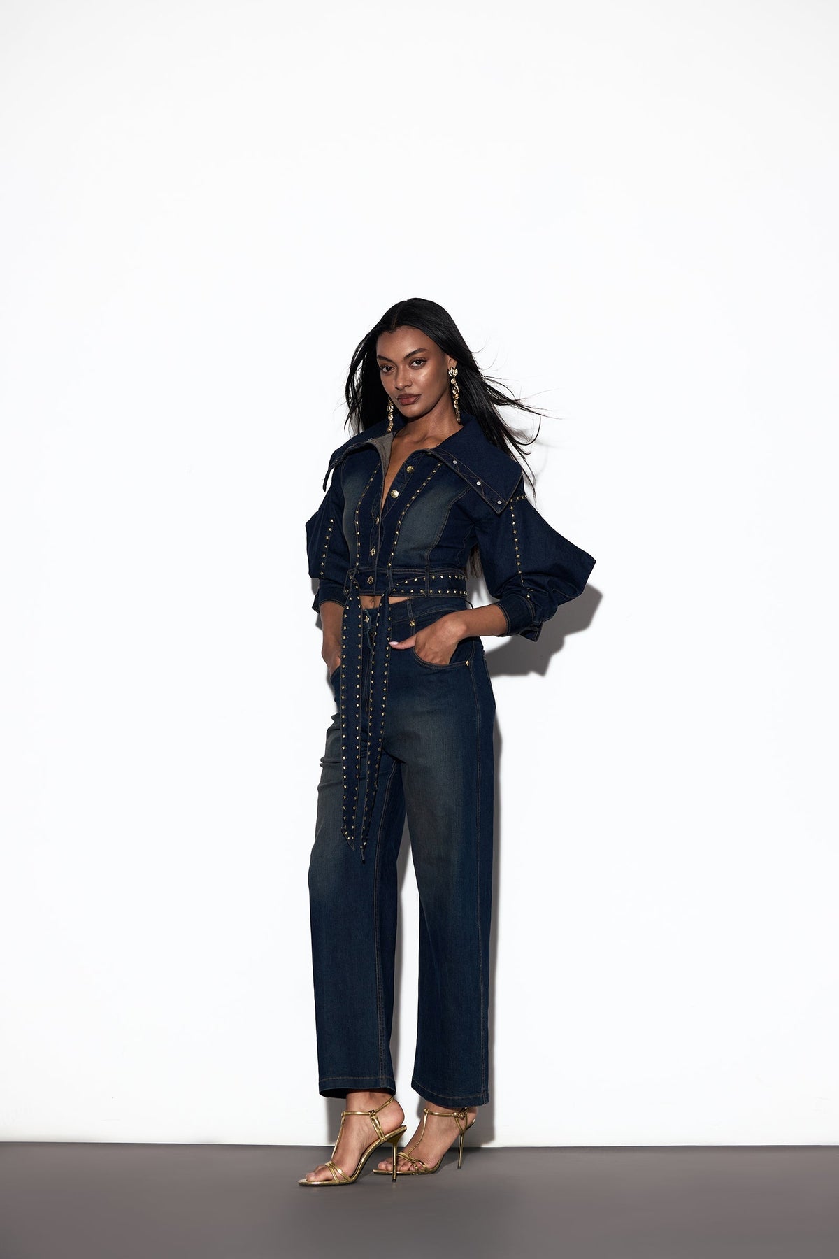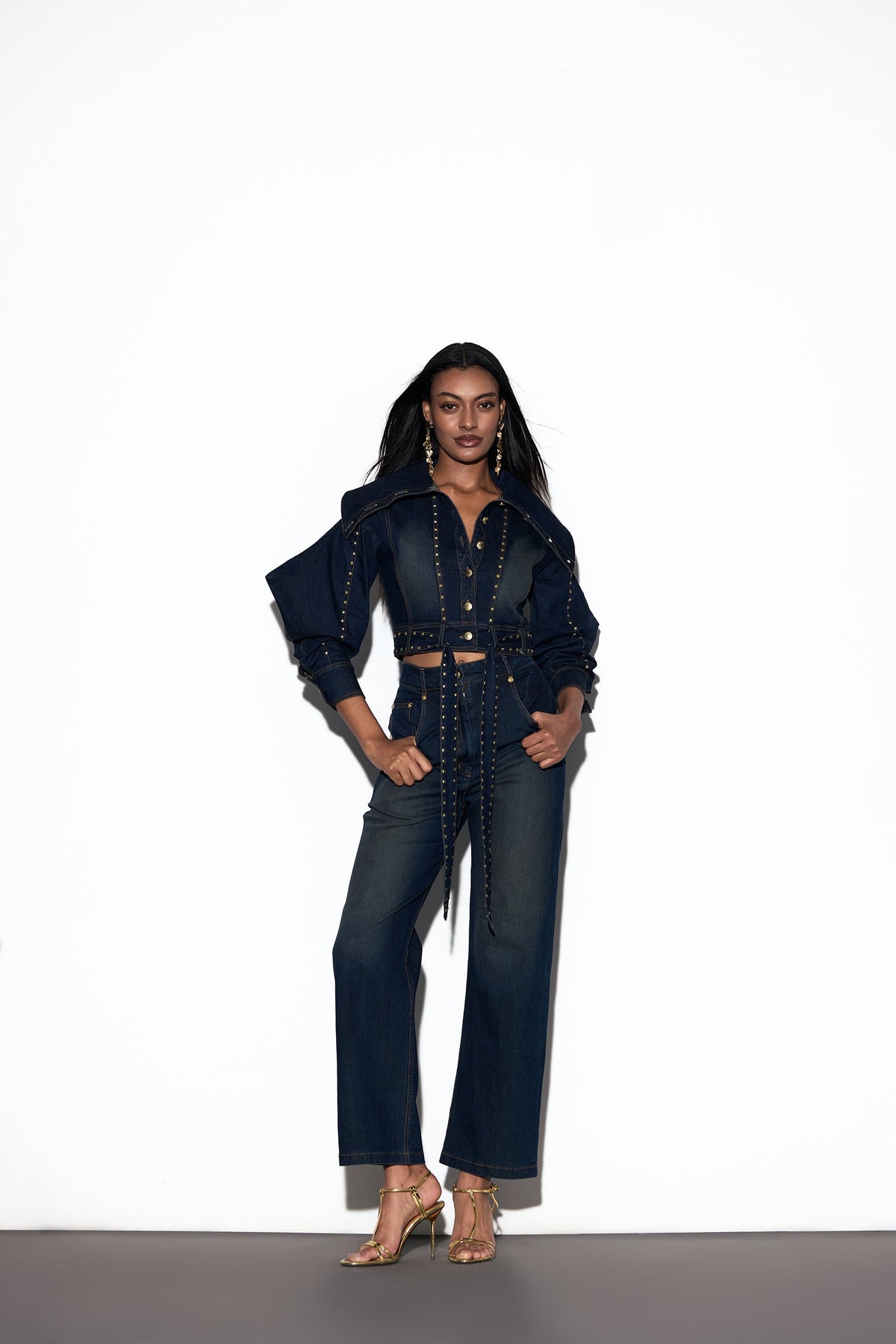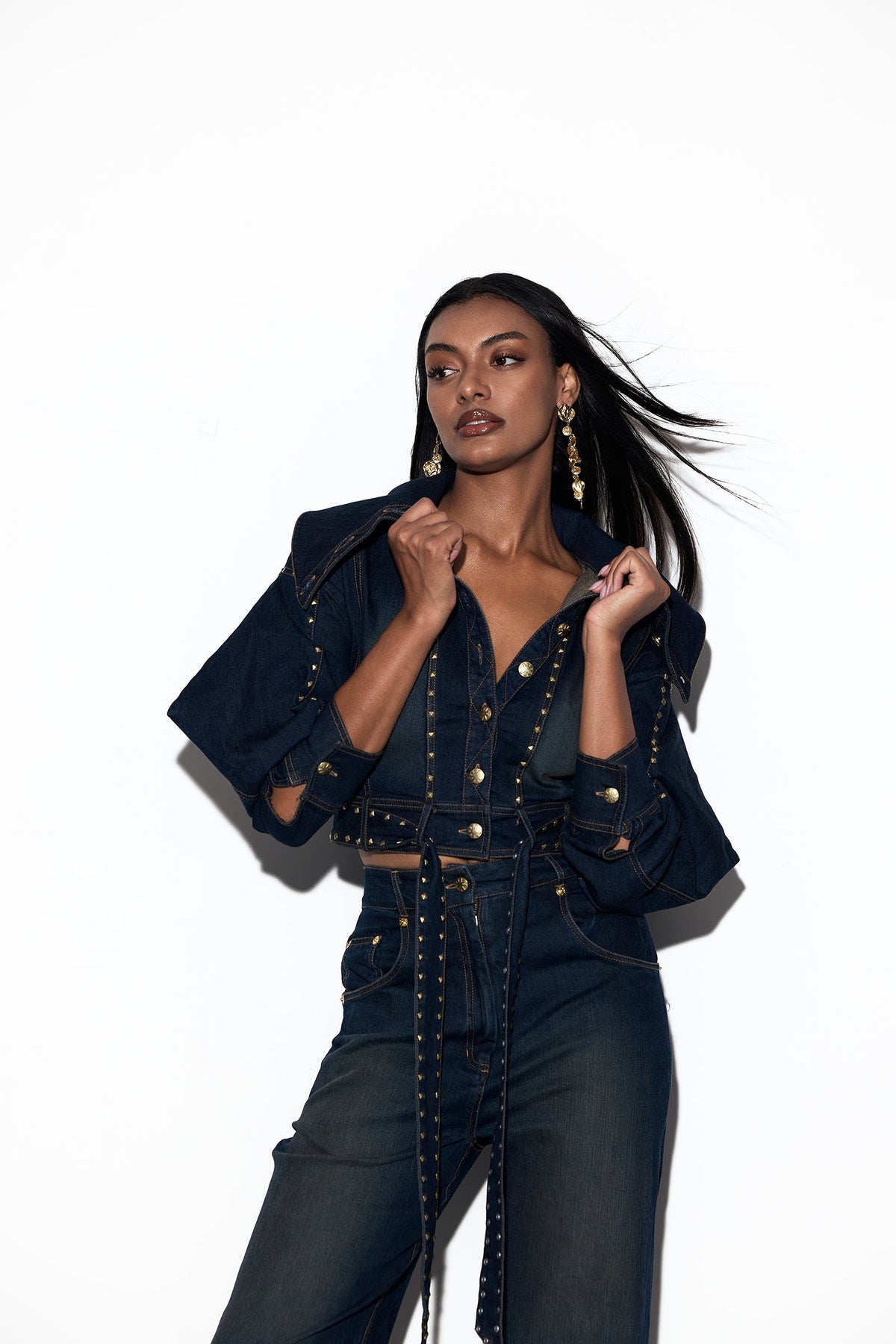 The KOYUKI SET is a statement of power and precision, blending sharp tailoring with modern detail. The jacket features an exaggerated collared neckline and full sleeves with pointed edges, secured with a front button-down closure. An attached belt cinches the waist, while rivets trace the sleeves, front seam, and belt, adding a gleam of strength to its structure. Paired with straight-leg denim trousers designed with a front button and zipper closure, side inseam pockets, and back patch pockets, the look is refined further with golden rivets accenting the pocket edges. Together, the set strikes a perfect balance of confidence, elegance, and understated drama.