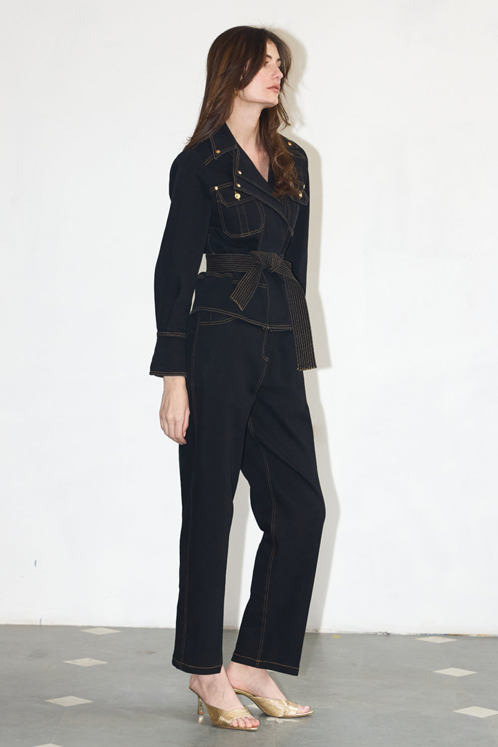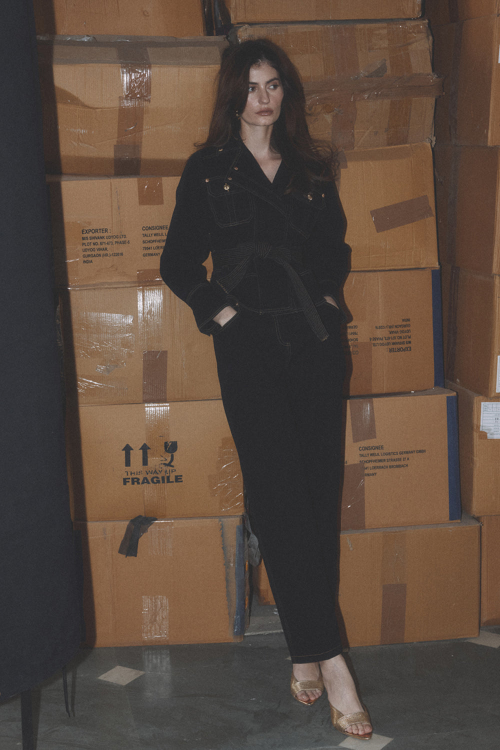 Power dressing, redefined. This belted jacket exudes effortless sophistication with a hint of edge, showcasing sharp tailoring and feminine details, making it the perfect piece to command attention wherever you go. Paired with denim trousers that fuse classic denim magic with a modern edge, these timeless trousers are elevated by gold accents and functional details, offering cool elegance for any occasion.